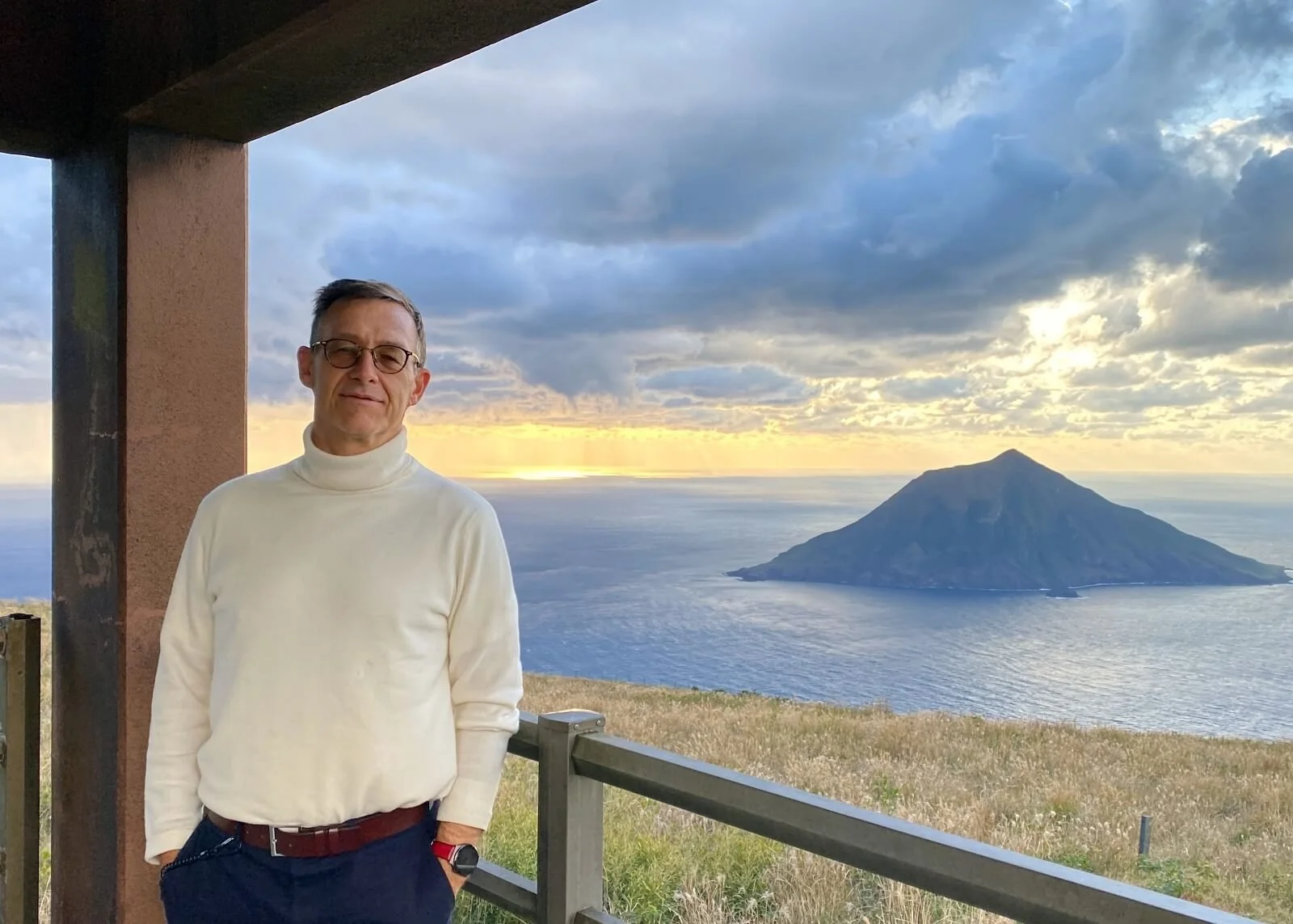 Dan Slater, founder of The Delphi Network, takes in the inspiring sunset view from Hachijo-Fuji, a highlight of any trip to this unique Tokyo retreat destination.